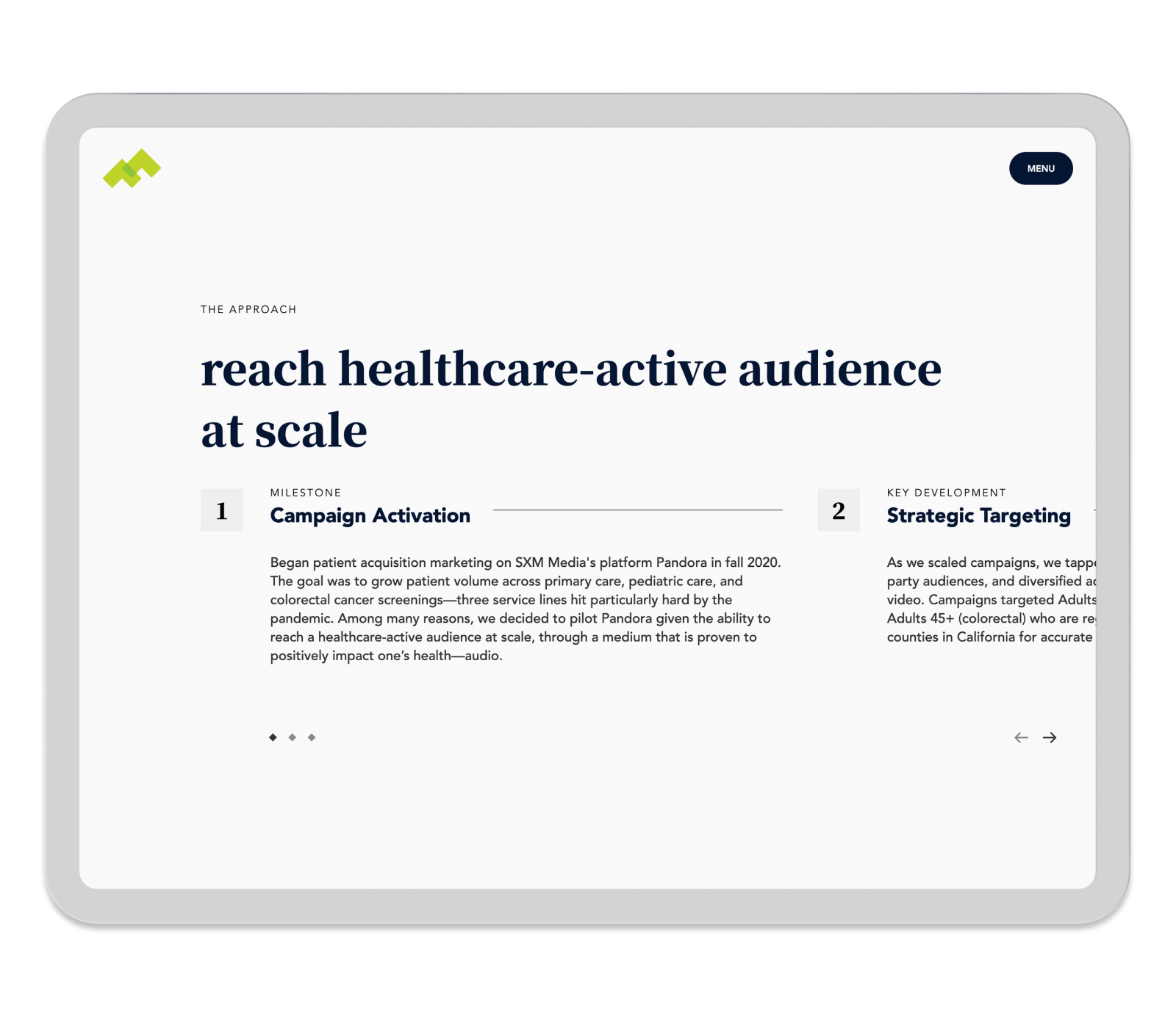 We partnered with our new BFFs at Fathom to research, design, and build an all-new website. One with the power to leverage Fathom’s experience with dozens of America’s top healthcare systems to bolster the agency’s position as a performance-driven healthcare marketing authority.